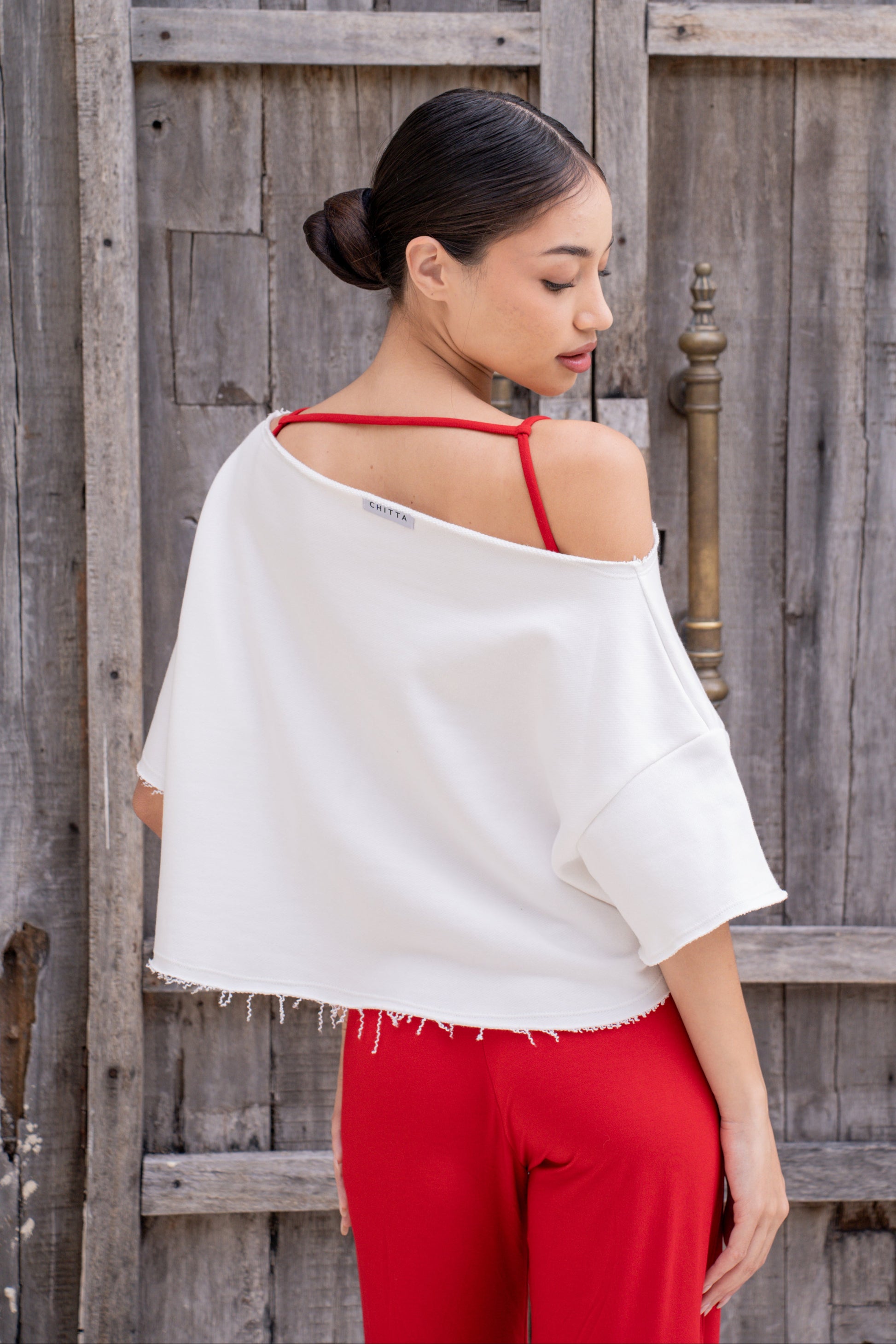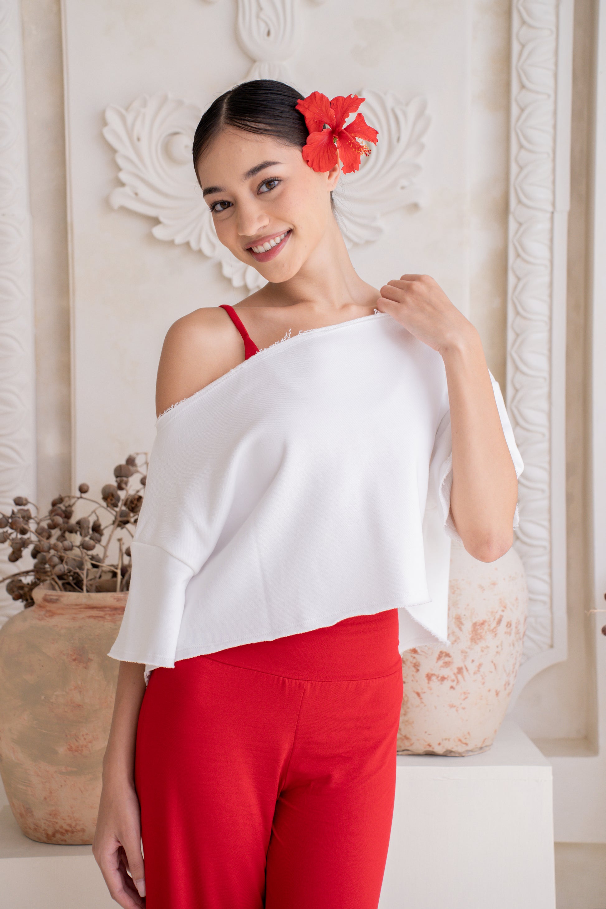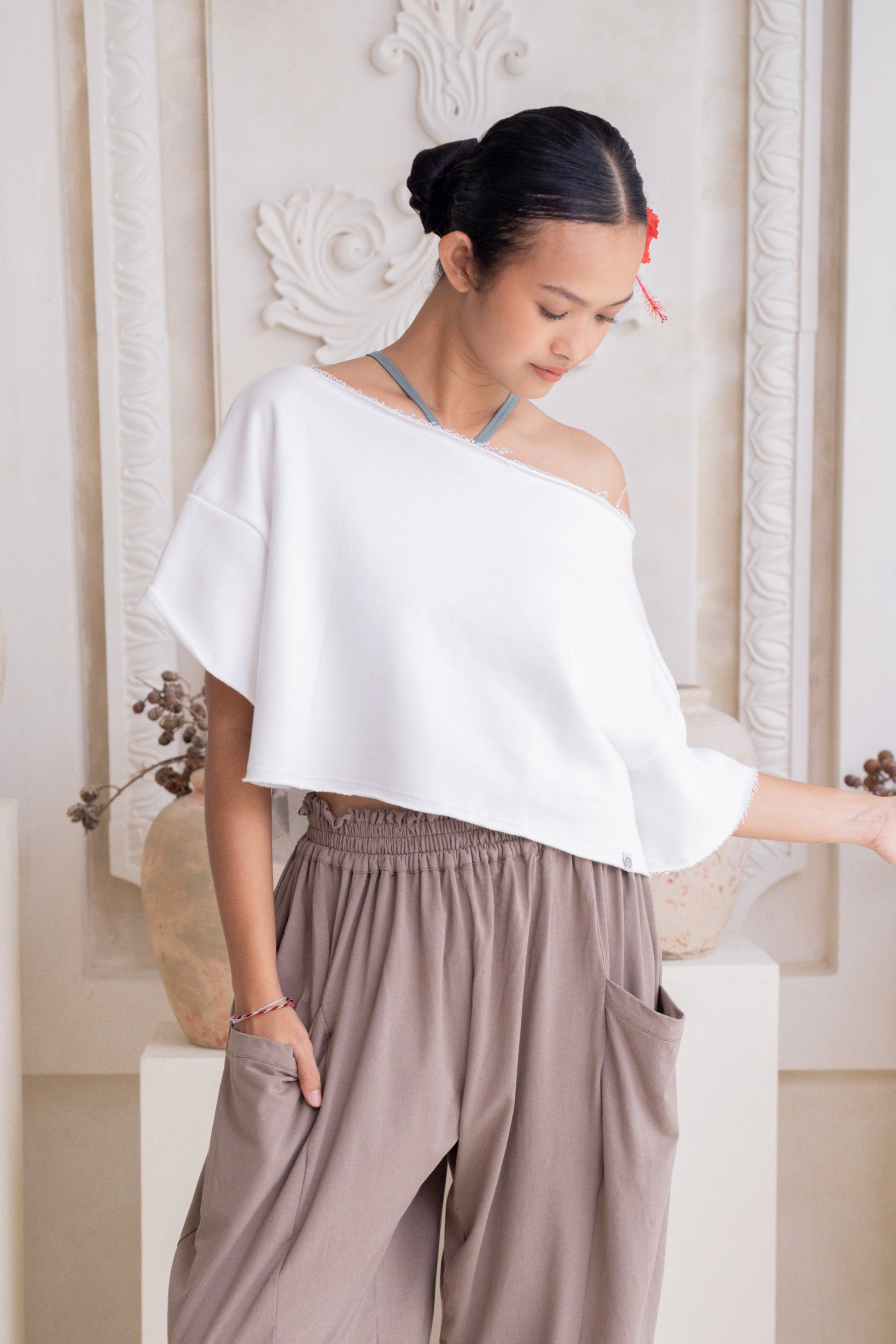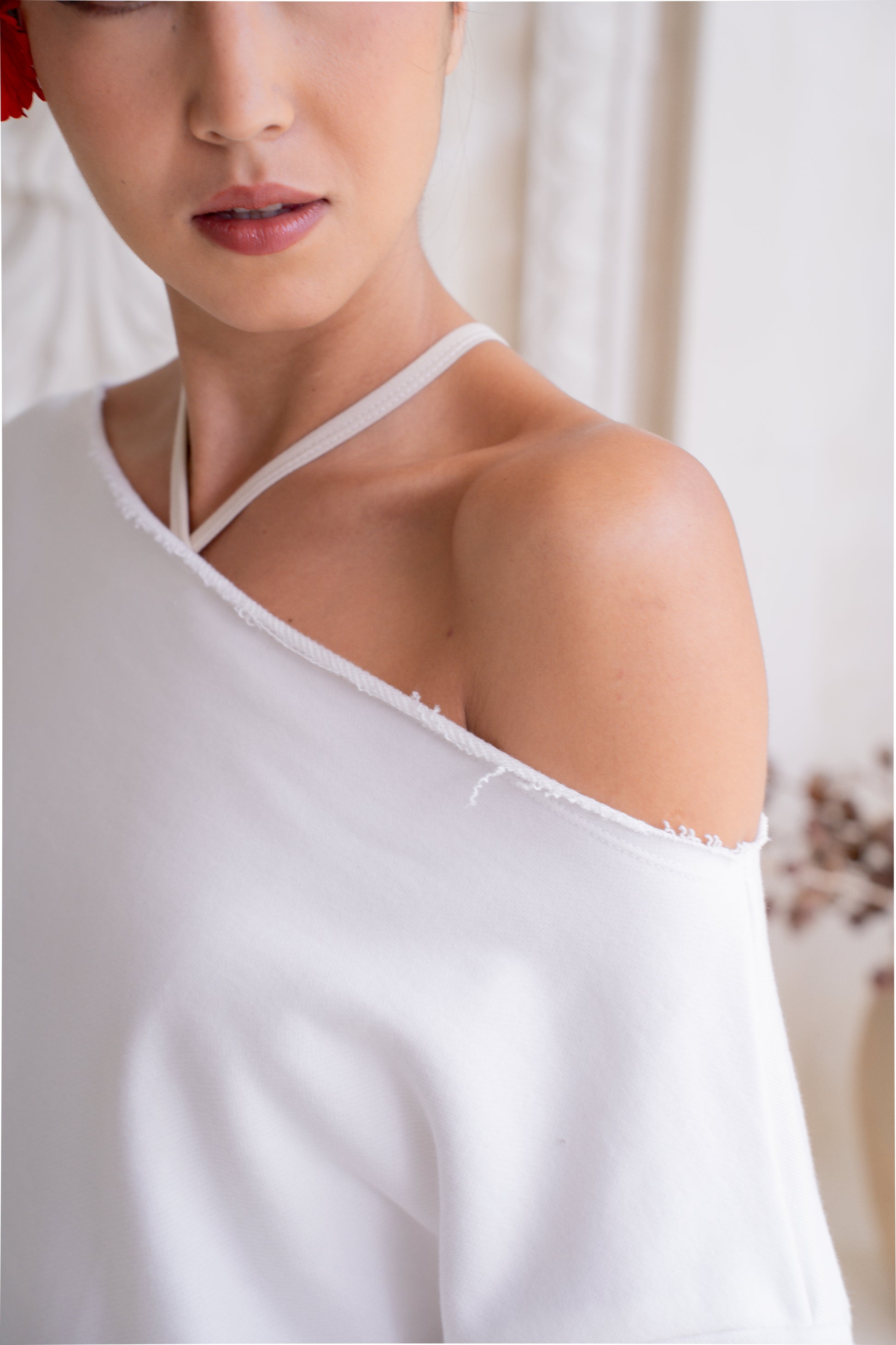 The Asha Sweatshirt in Milk is a fusion of elegant drape and casual comfort. This top features a relaxed, off-shoulder neckline and a semi-cropped length, creating a laid-back, modern silhouette. The raw edges on the neckline, hem, and sleeves add a unique, organic feel, celebrating a perfectly undone style.