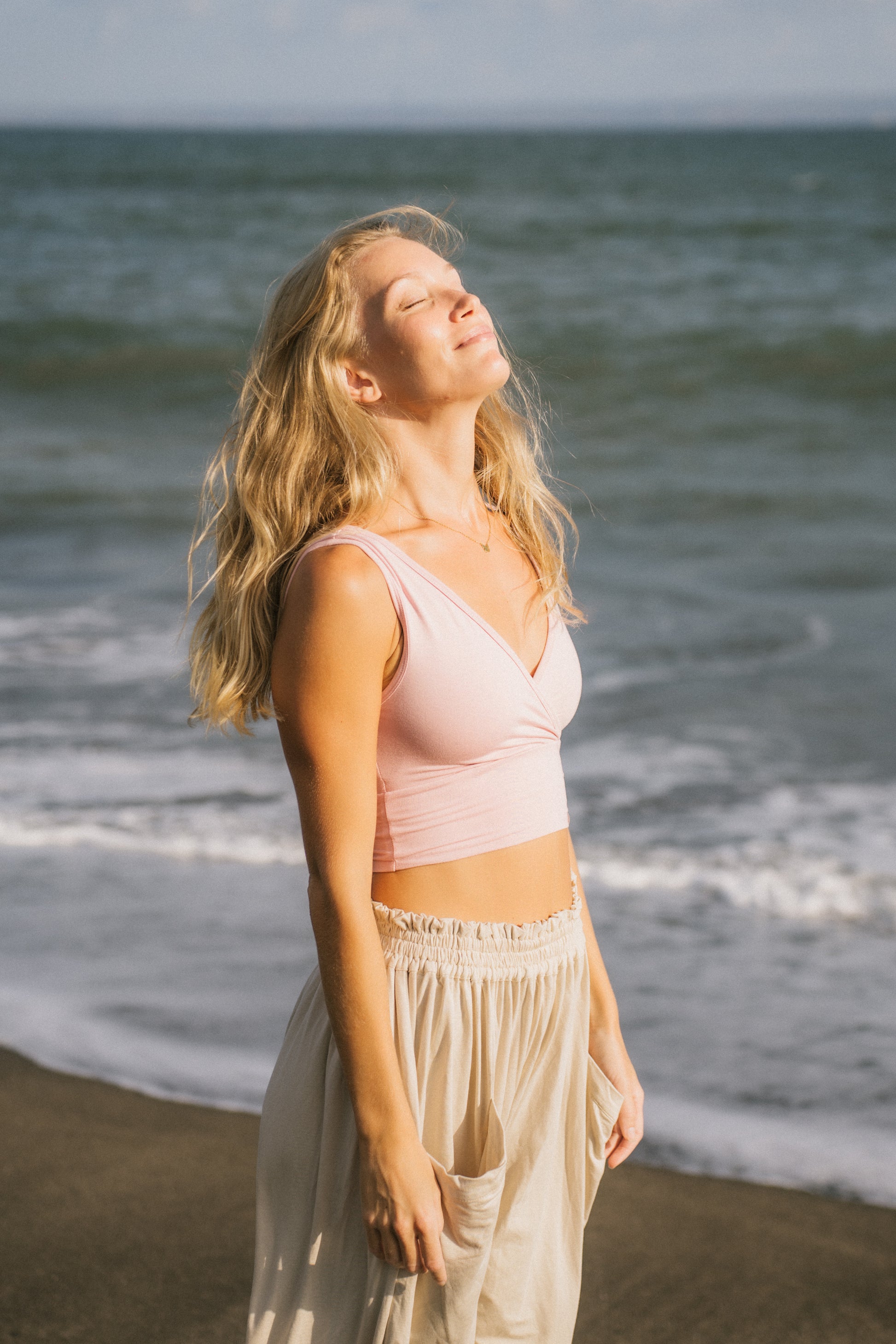 The wrap-style neckline enhances natural form and offers subtle support. Its semi-cropped length brings a hint of modernity, while the fabric’s gentle stretch moves with you. In Cherry Blossom, Drishti becomes a graceful statement—soft yet grounded, delicate yet empowering.