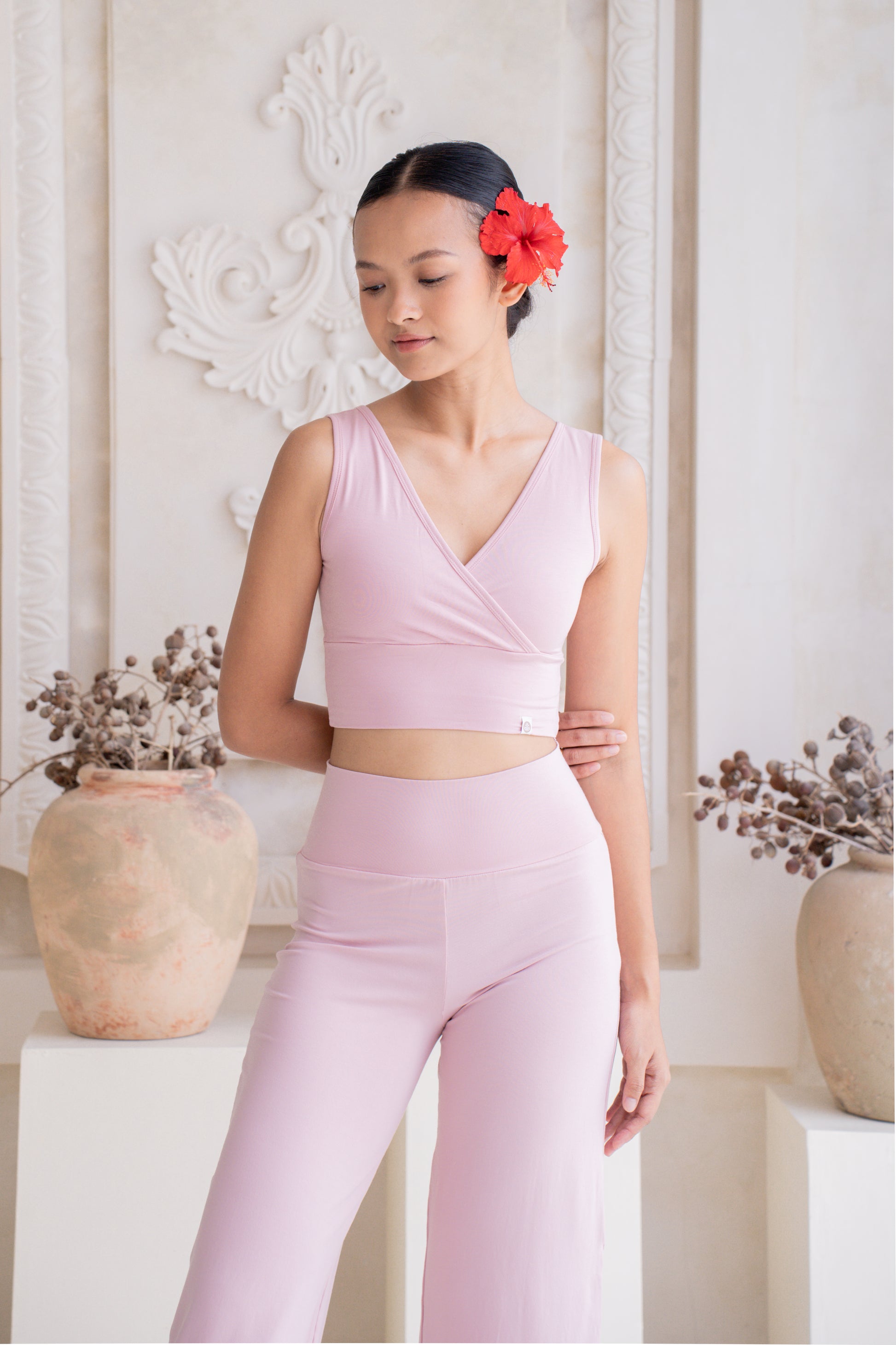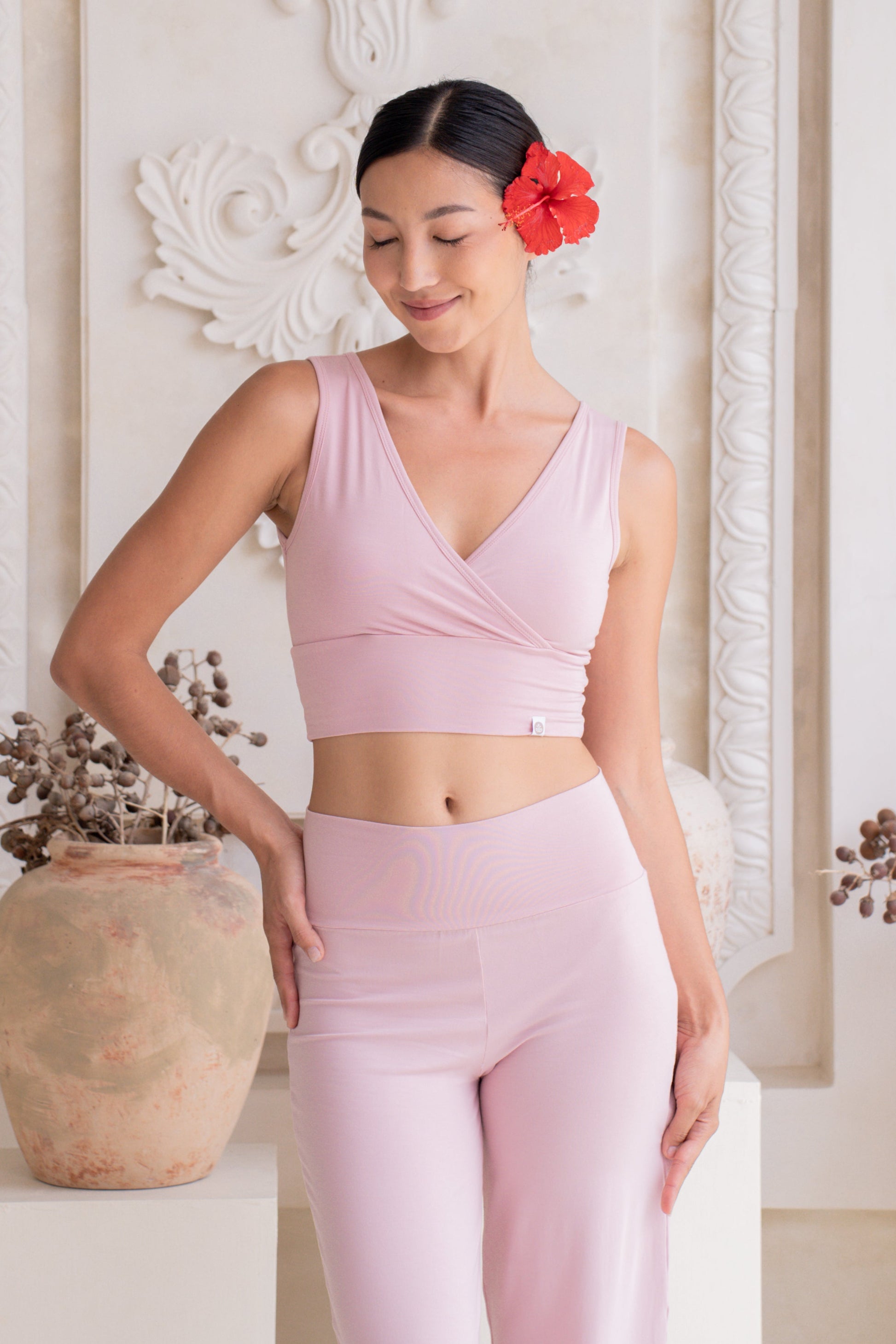 Drishti Wrap Top in Cherry Blossom invites softness and feminine strength into your everyday ritual. Designed with a timeless wrap silhouette and gentle V-neckline, this semi-cropped top offers light support and a flattering, body-skimming shape.