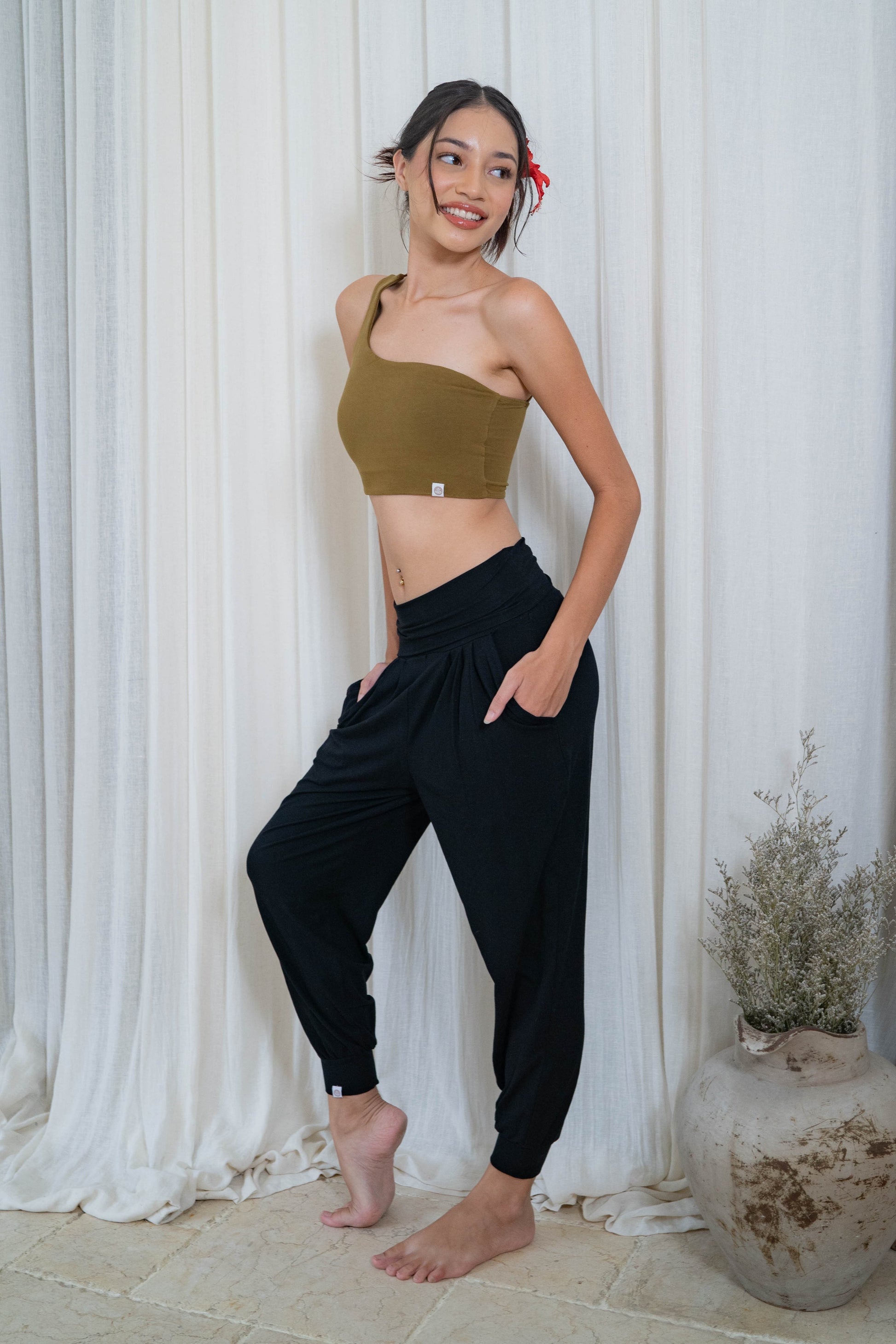 Introducing our Black Hatha Aladdin Pants, handcrafted with love and care in Bali. These pants seamlessly blend comfort and versatility, featuring a foldable waistband and convenient side pockets designed to accommodate your active lifestyle.