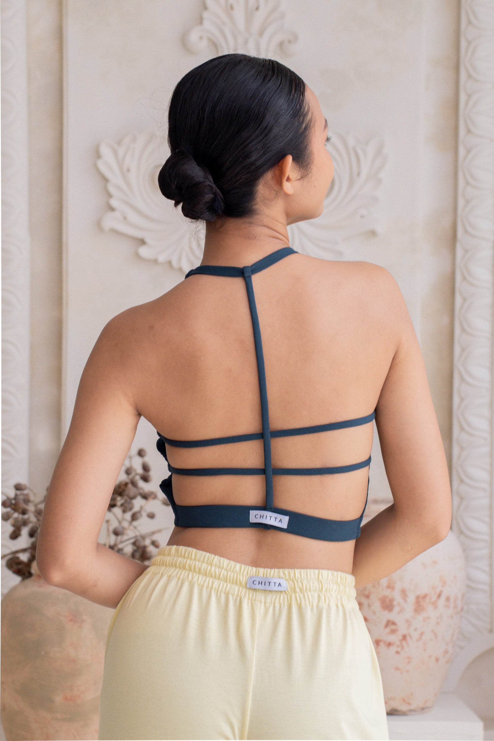 Kaya Strapline Top in Dark Teal offers a bold yet graceful silhouette with details that draw the eye from every angle. The front features a soft deep V neckline, accentuated by delicate shirring at the center chest for a feminine, gathered effect. At the back, two fine horizontal straps and a supportive bottom band are intersected by a single vertical strap creating a clean, architectural line that contours and frames the back beautifully.