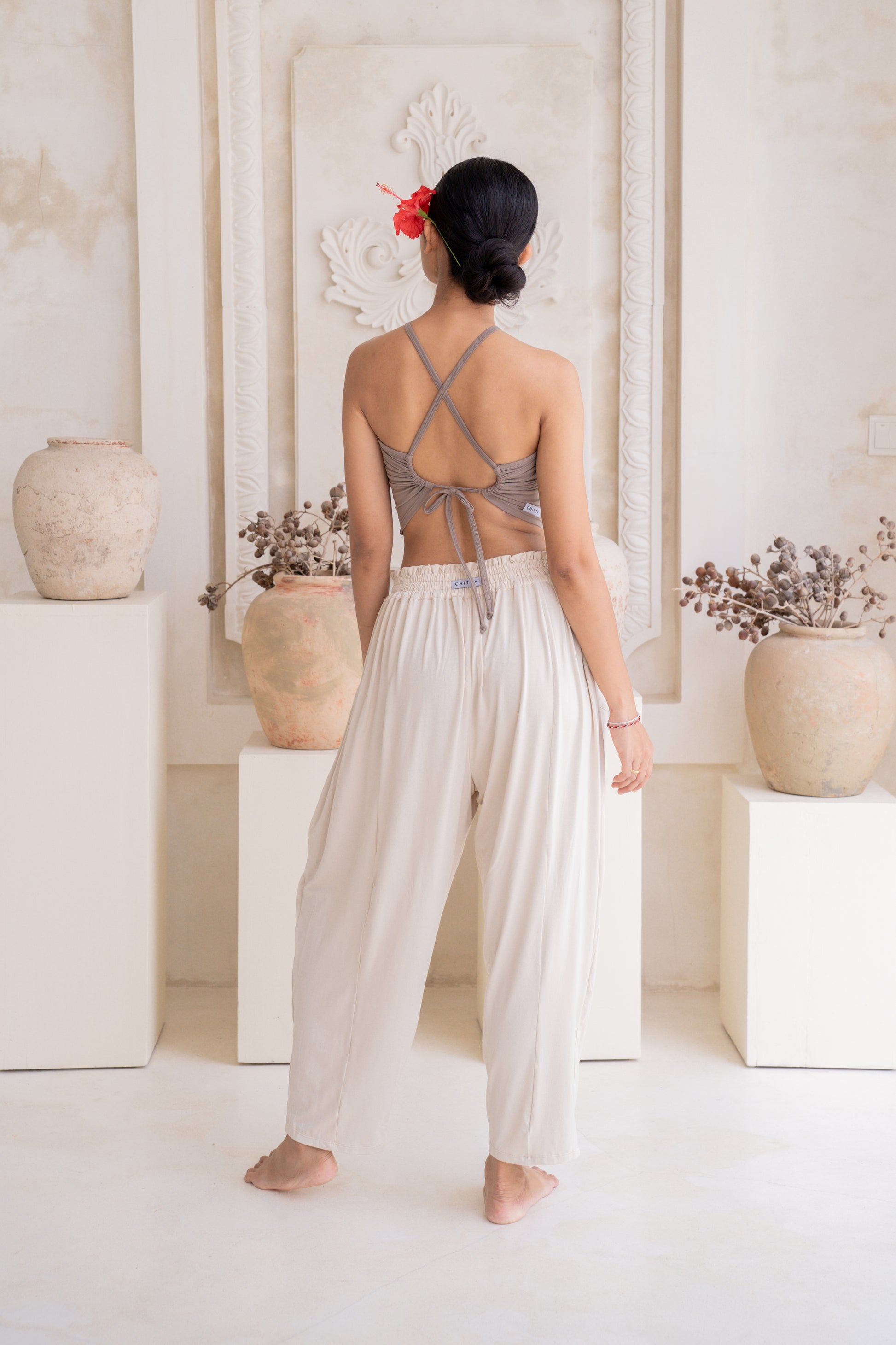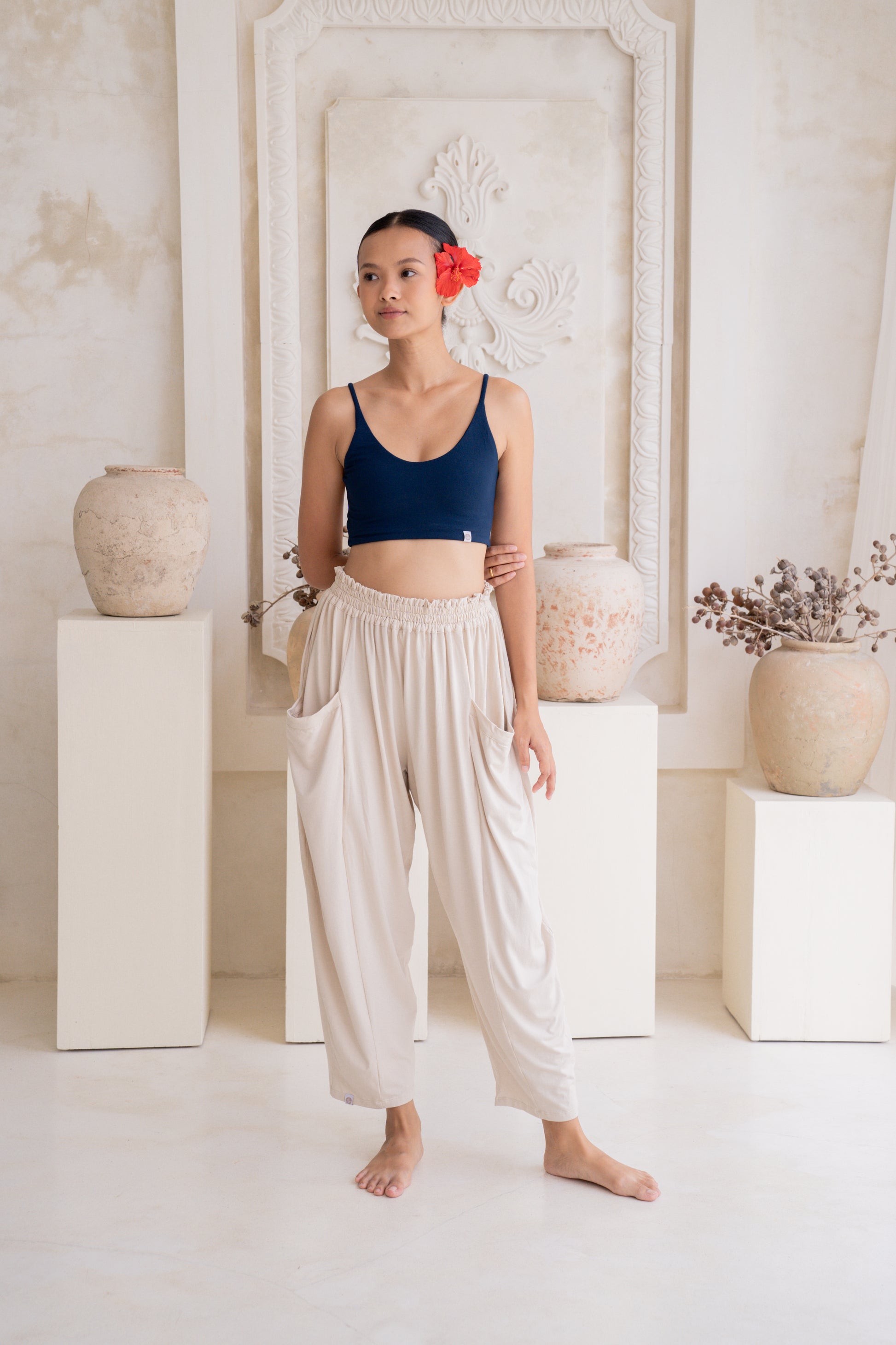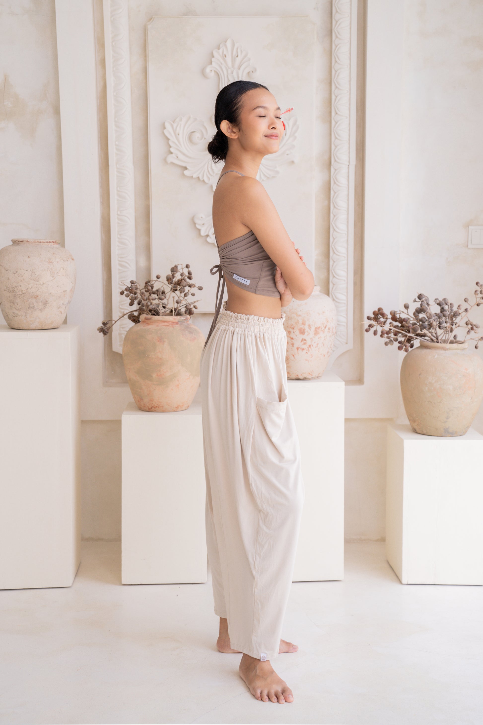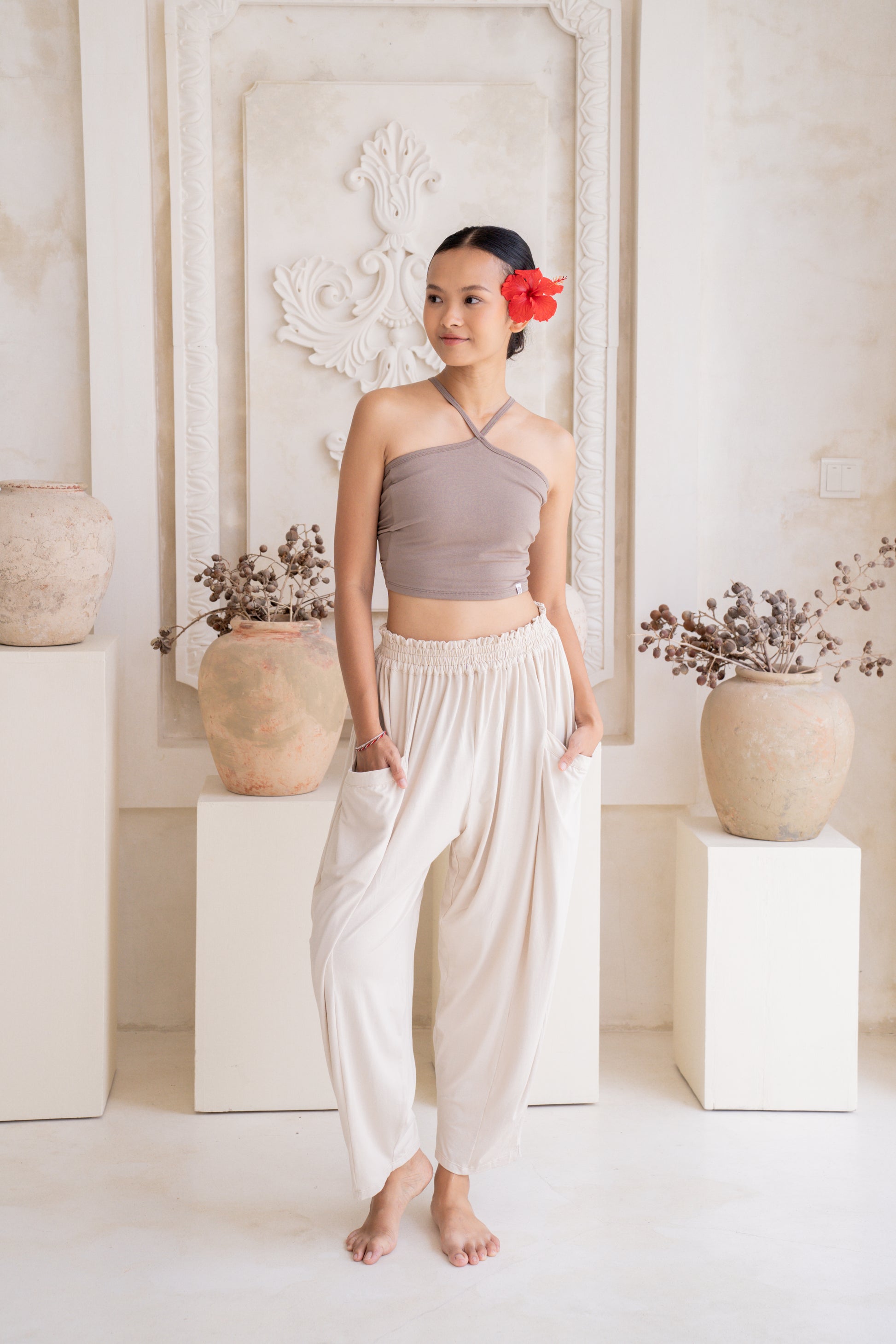 Maya Draped Pants with Pockets in Seashell evoke effortless grace with their relaxed carrot silhouette and flowing drapes. The two roomy front pockets add practical charm, while the shirred waist detail brings subtle texture and a comfortable fit.