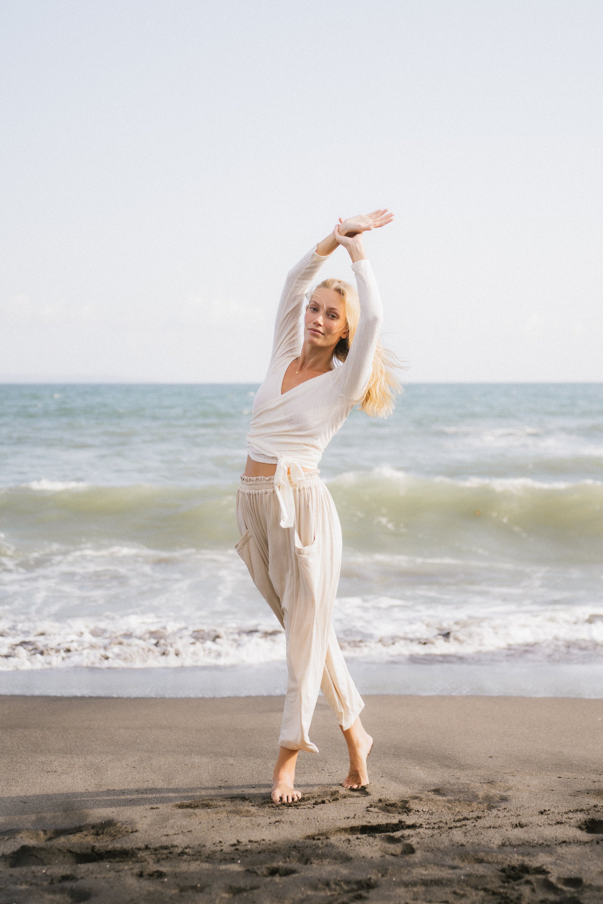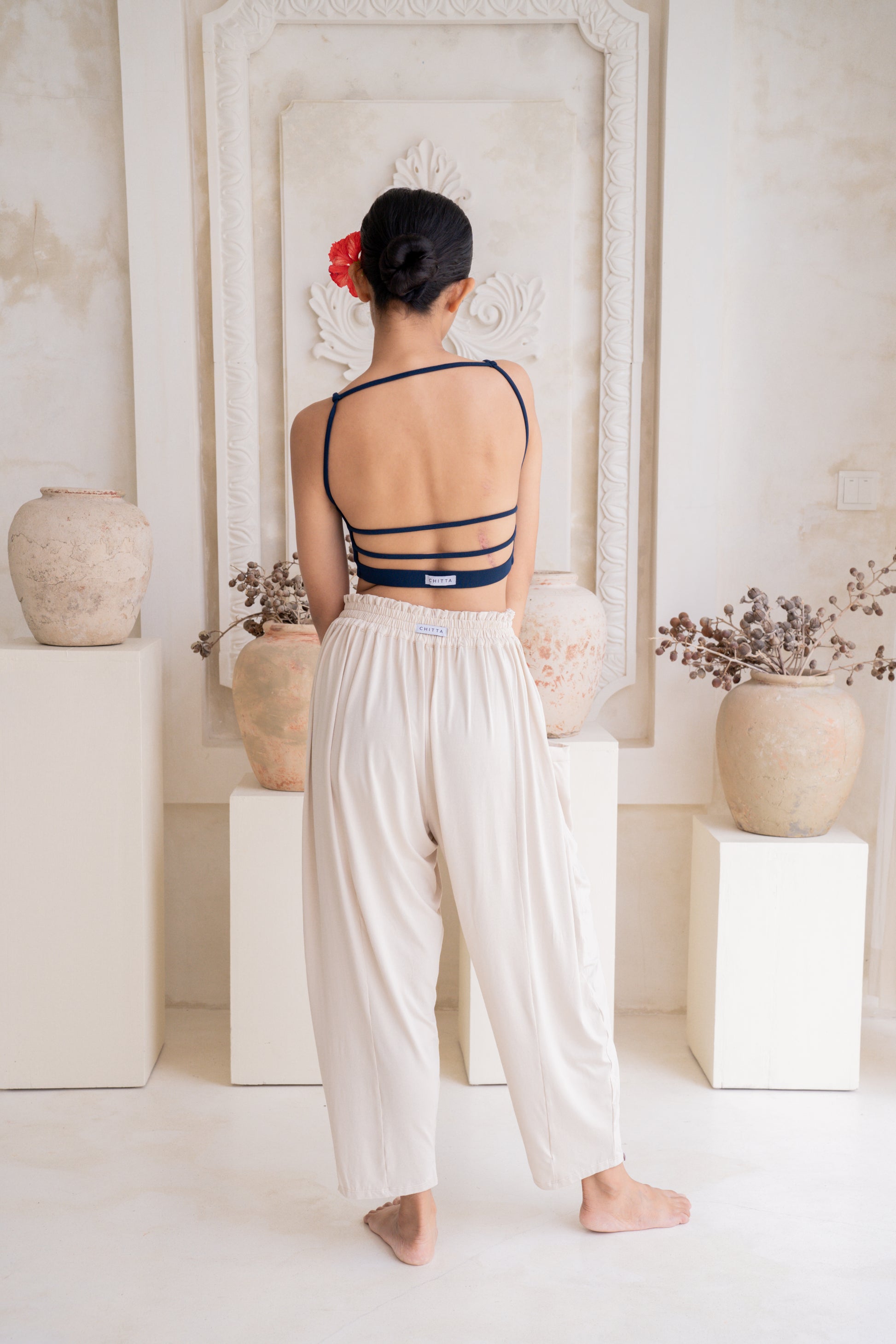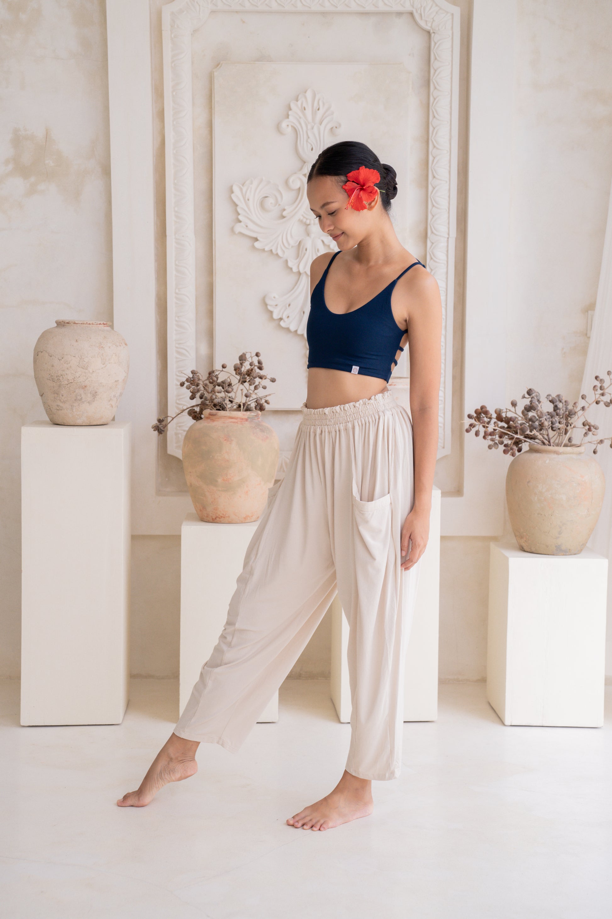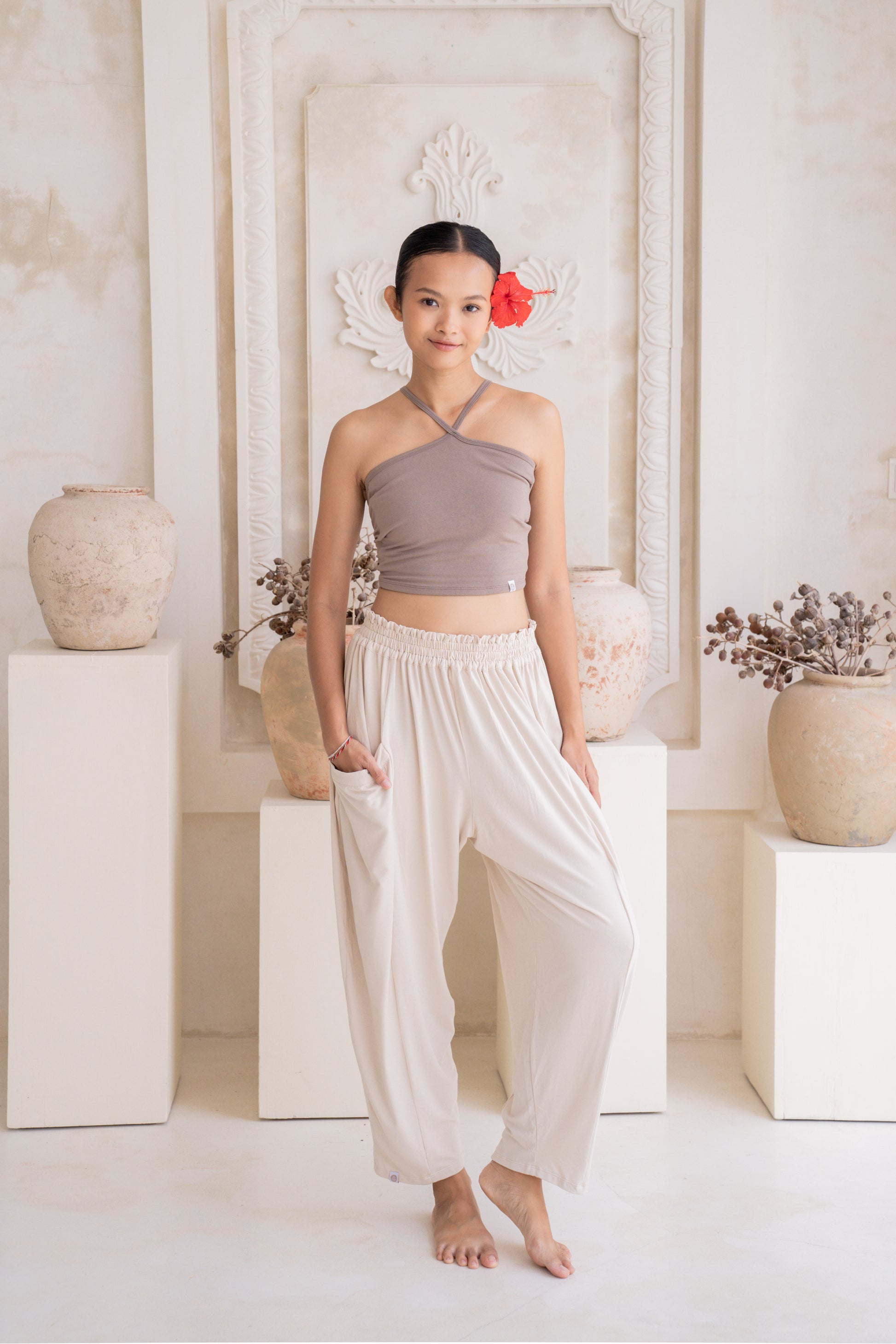 Maya Draped Pants with Pockets in Seashell evoke effortless grace with their relaxed carrot silhouette and flowing drapes. The two roomy front pockets add practical charm, while the shirred waist detail brings subtle texture and a comfortable fit.