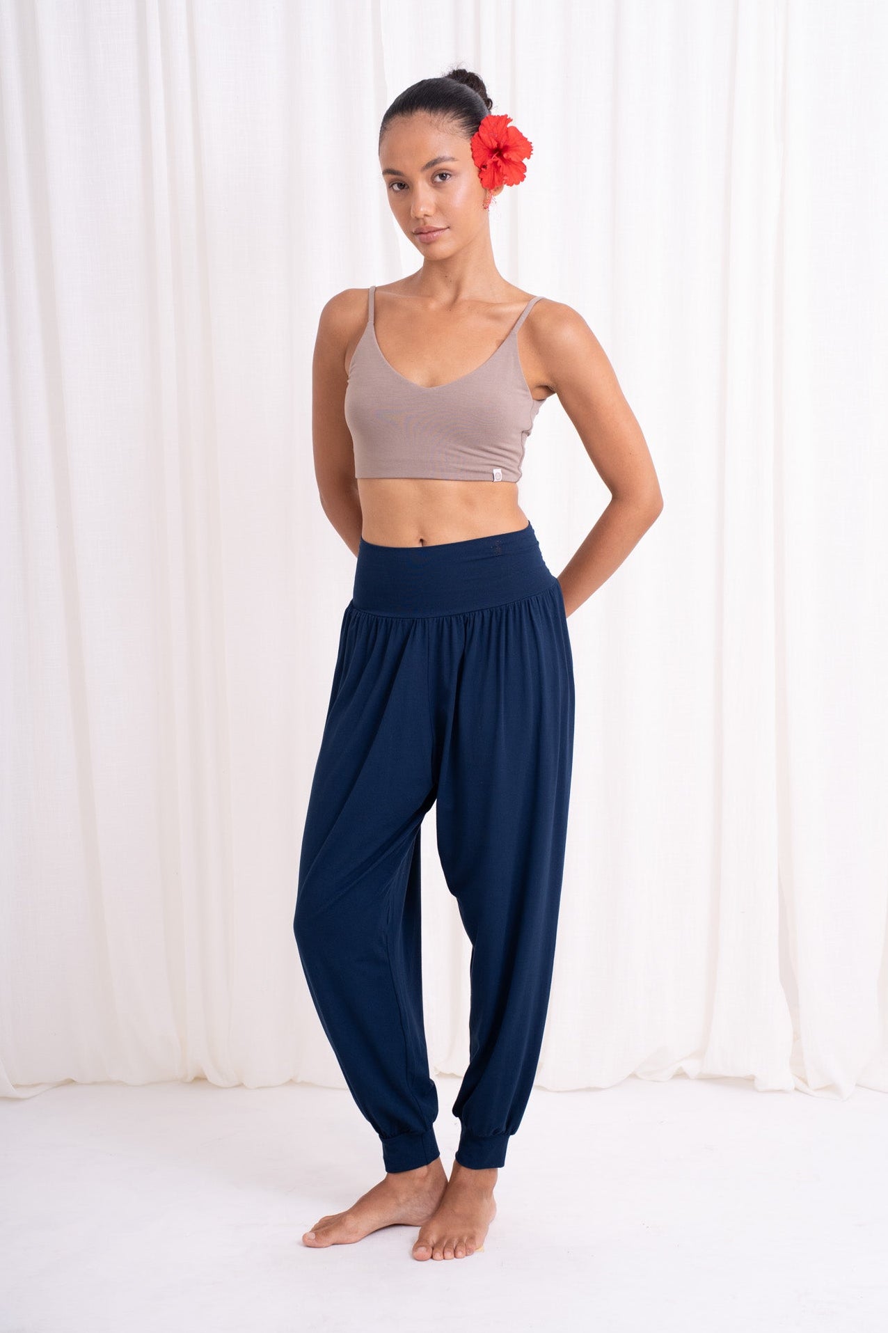 Samata Harem Pants in Midnight showcase a relaxed, flowing silhouette designed for effortless comfort and style. The airy shape allows for natural freedom of movement and a breezy feel, making them ideal for mindful practice or relaxed everyday wear. A simple, wide waistband gently holds the waist, creating a smooth and streamlined look without ruching or gathers for a clean, refined finish.