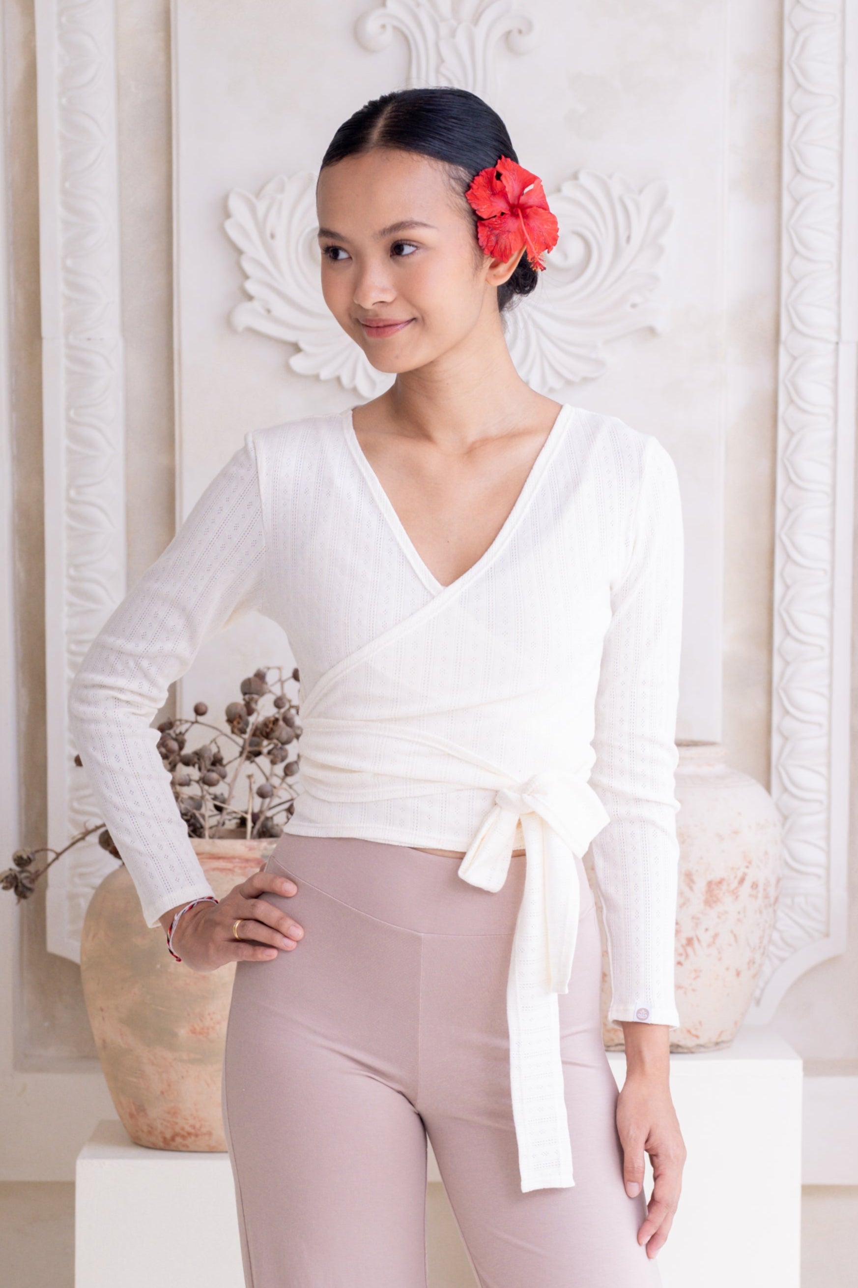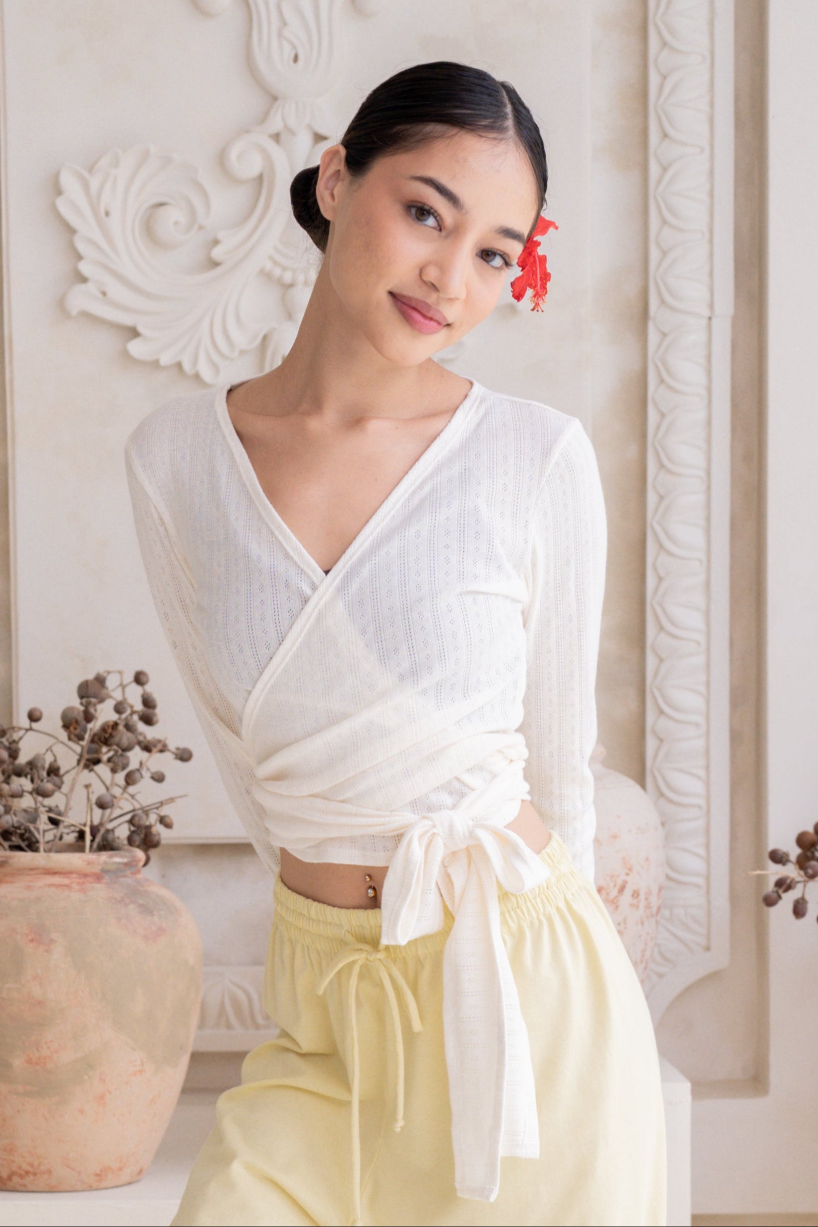 Sara Wrap Pointelle Cardigan in French Vanilla is handcrafted from premium 100% cotton pointelle ribbed fabric, known for its exceptional softness and breathable comfort. This luxurious knit features a delicate openwork pattern that adds refined texture and subtle elegance, elevating a classic wrap cardigan into a standout piece.