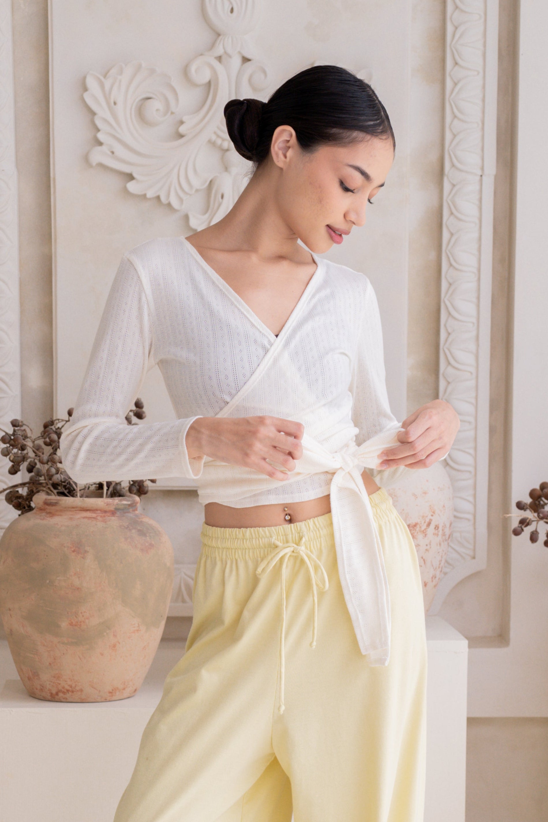 With long wrap-around straps, the Sara allows you to create a personalized, flattering fit that moves effortlessly with your body. The warm Vanilla hue enhances the cozy, inviting nature of this lightweight cardigan—perfect for layering or wearing on its own with understated sophistication.