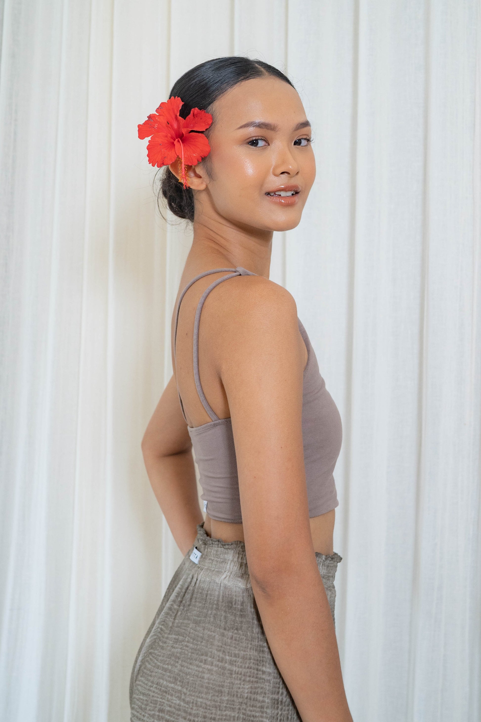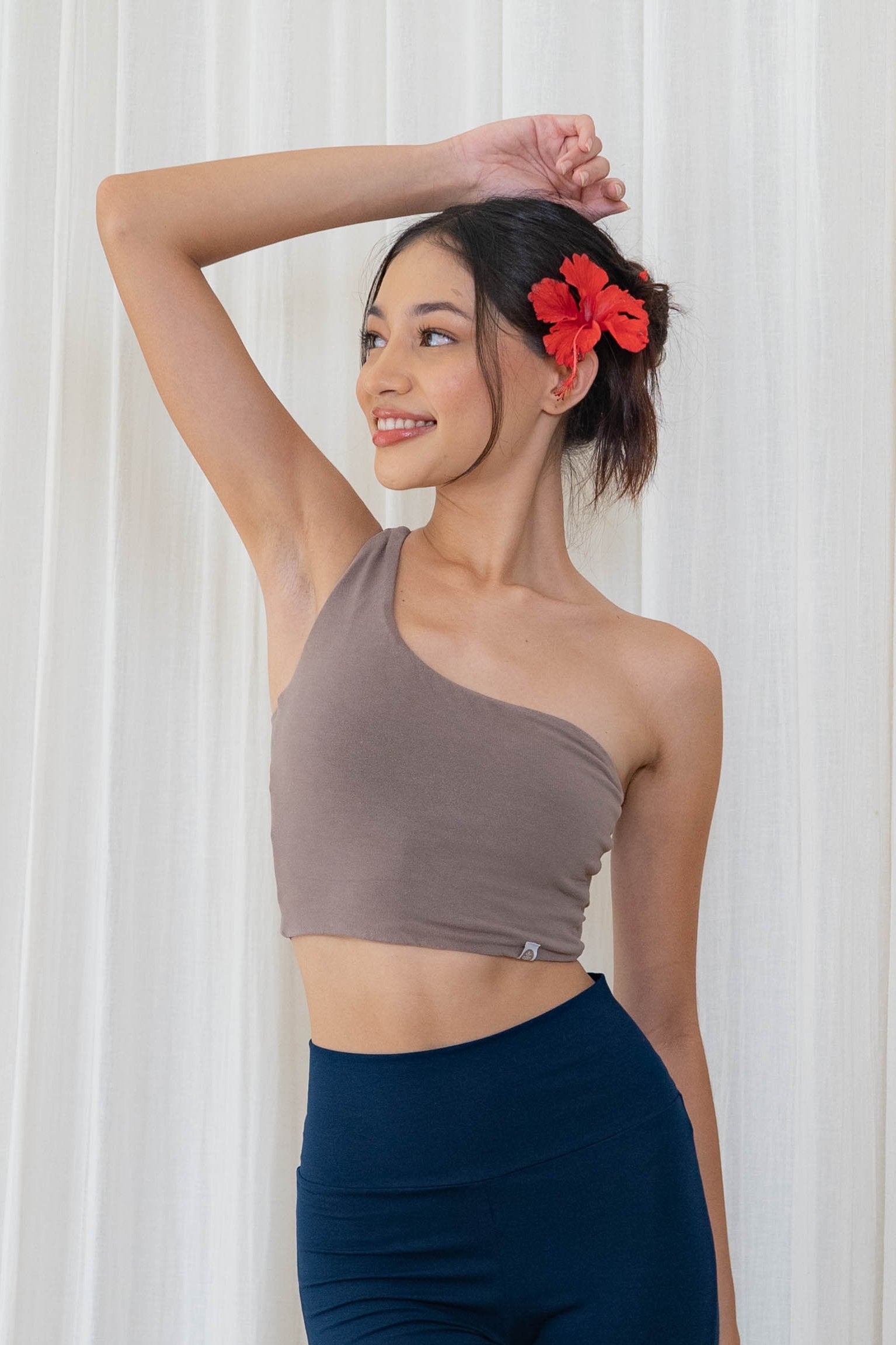 Embrace the understated elegance of the Satya Off-shoulder Top in the luxurious Sable hue. Handcrafted with care in Bali, this top effortlessly blends style and comfort, making it a perfect choice for both yoga sessions and everyday wear.