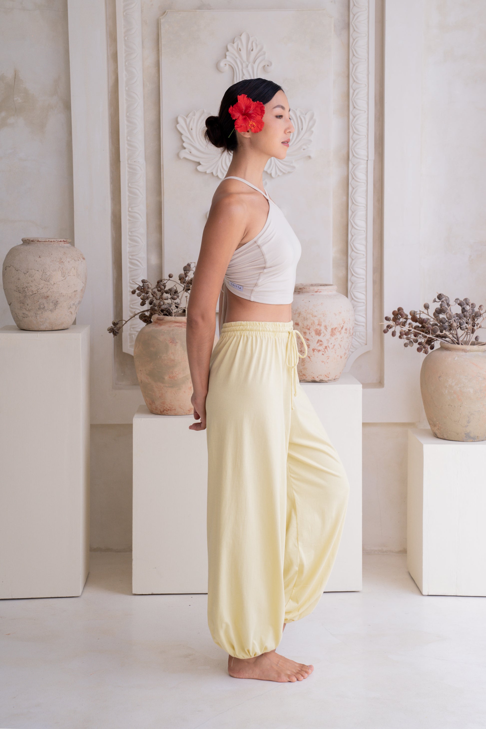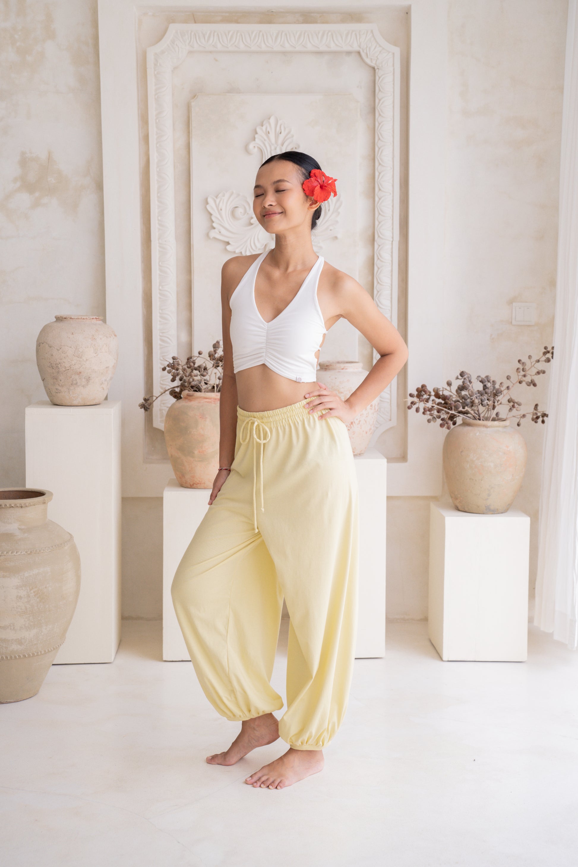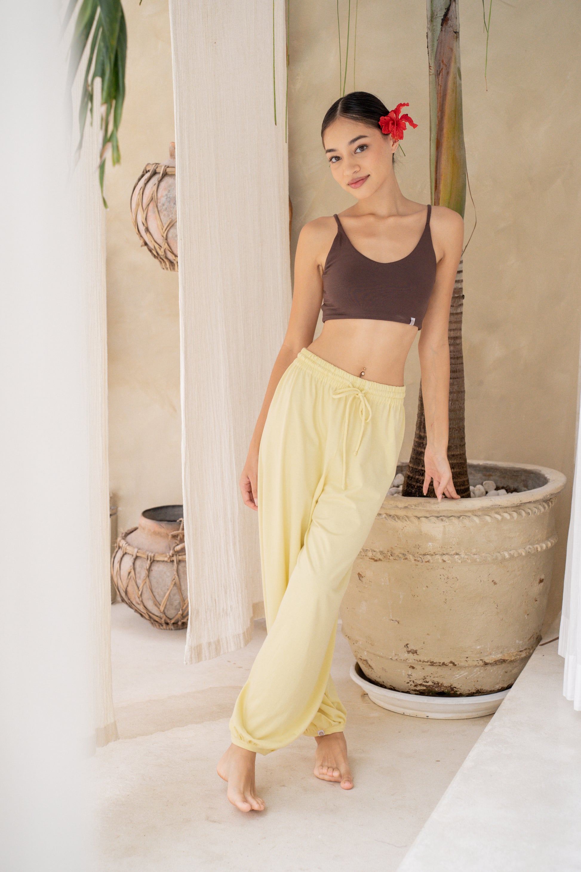 Soma Wide Joggers in Lemon are designed to offer ease, softness, and fluidity in motion. With a wide-leg silhouette and full-length cut, they bring a relaxed yet elongated shape that flatters taller frames while offering a baggy, laid-back fit for petite wearers. The soft waistband includes an adjustable drawstring for a personalized and comfortable hold.