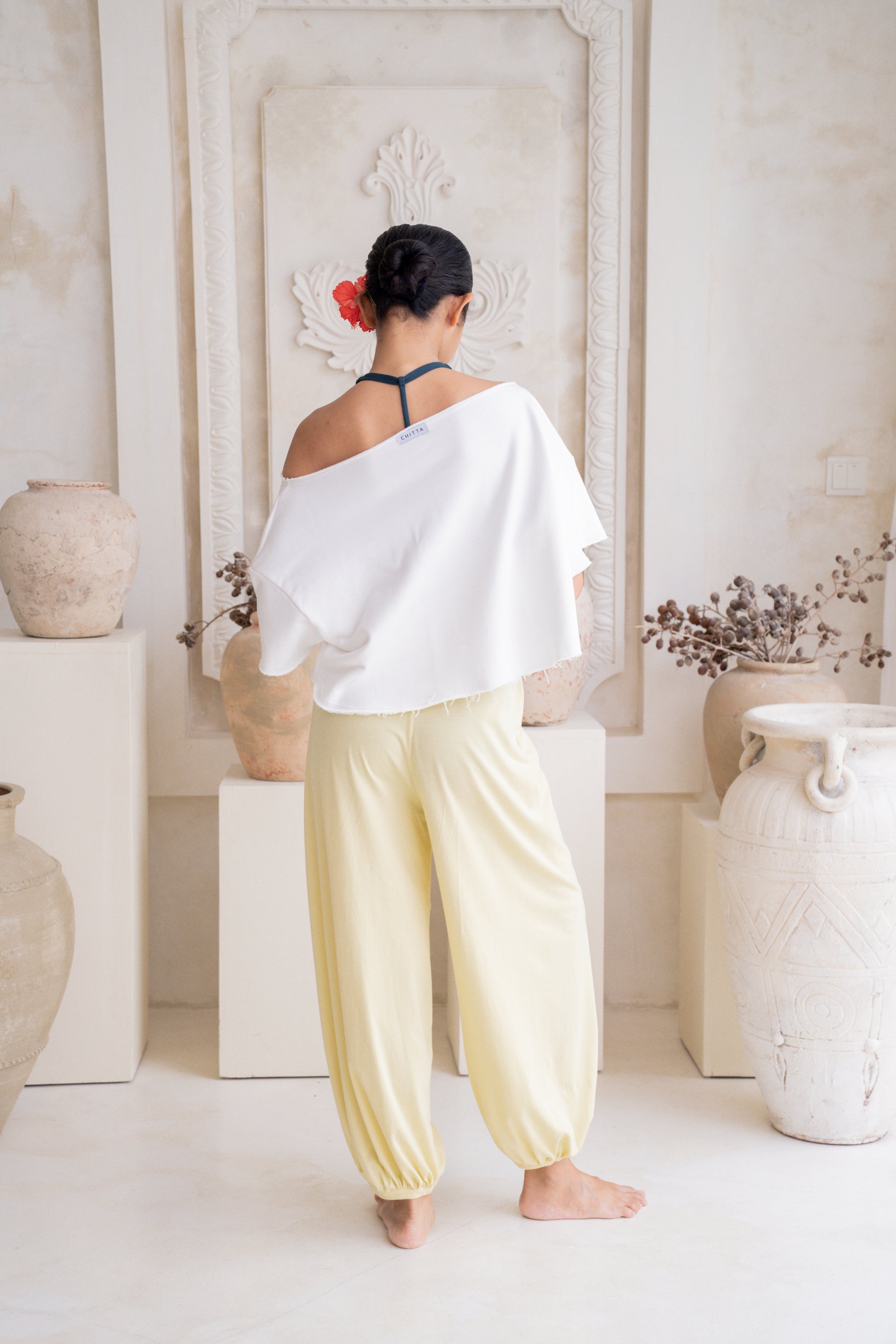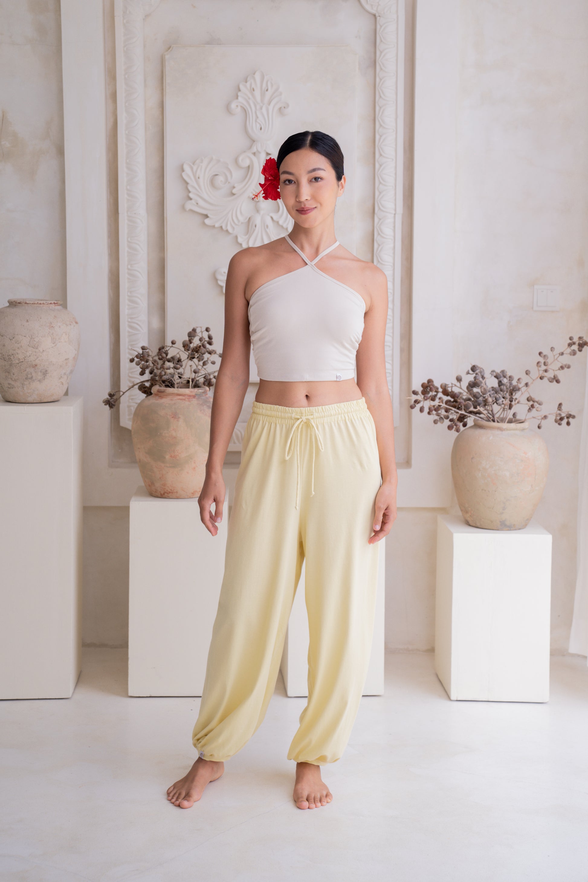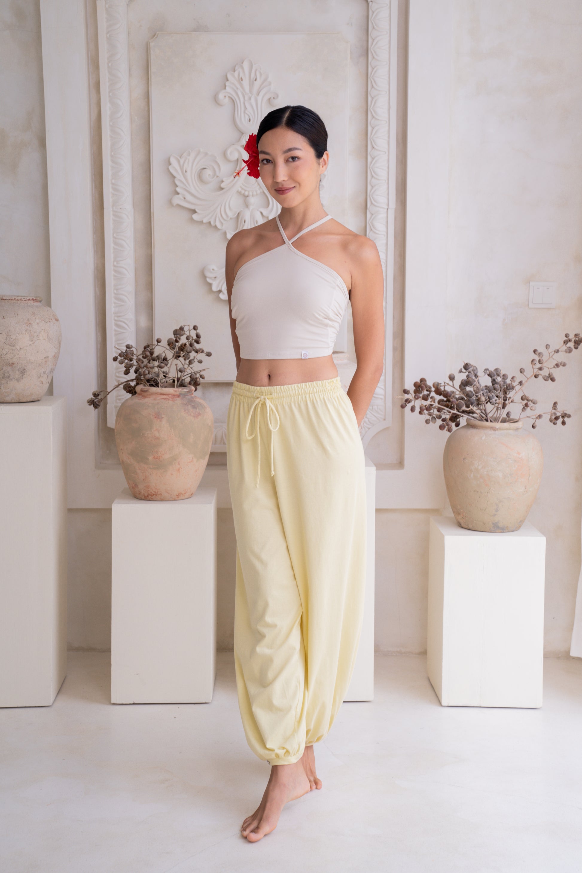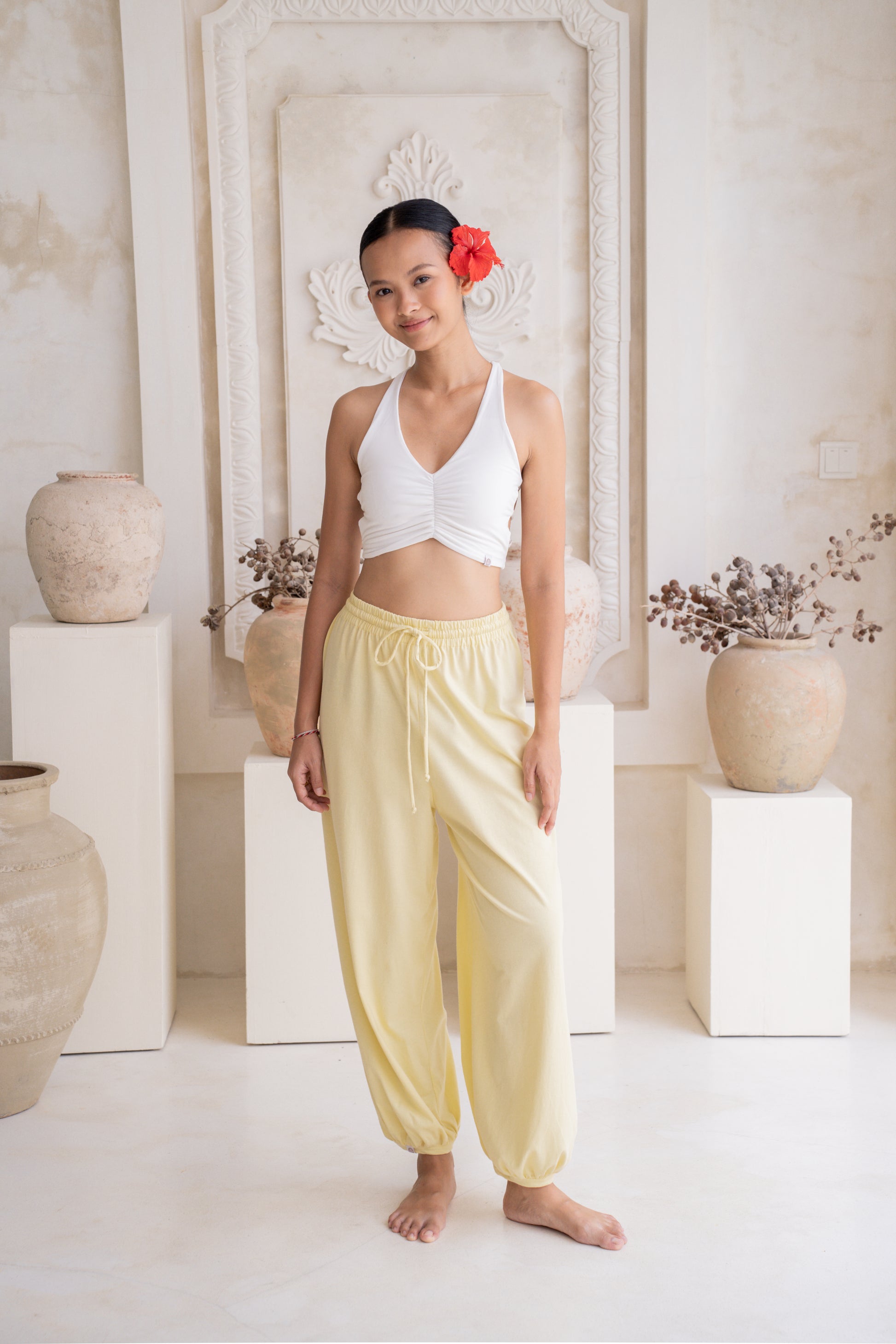 Soma Wide Joggers in Lemon are designed to offer ease, softness, and fluidity in motion. With a wide-leg silhouette and full-length cut, they bring a relaxed yet elongated shape that flatters taller frames while offering a baggy, laid-back fit for petite wearers. The soft waistband includes an adjustable drawstring for a personalized and comfortable hold.
