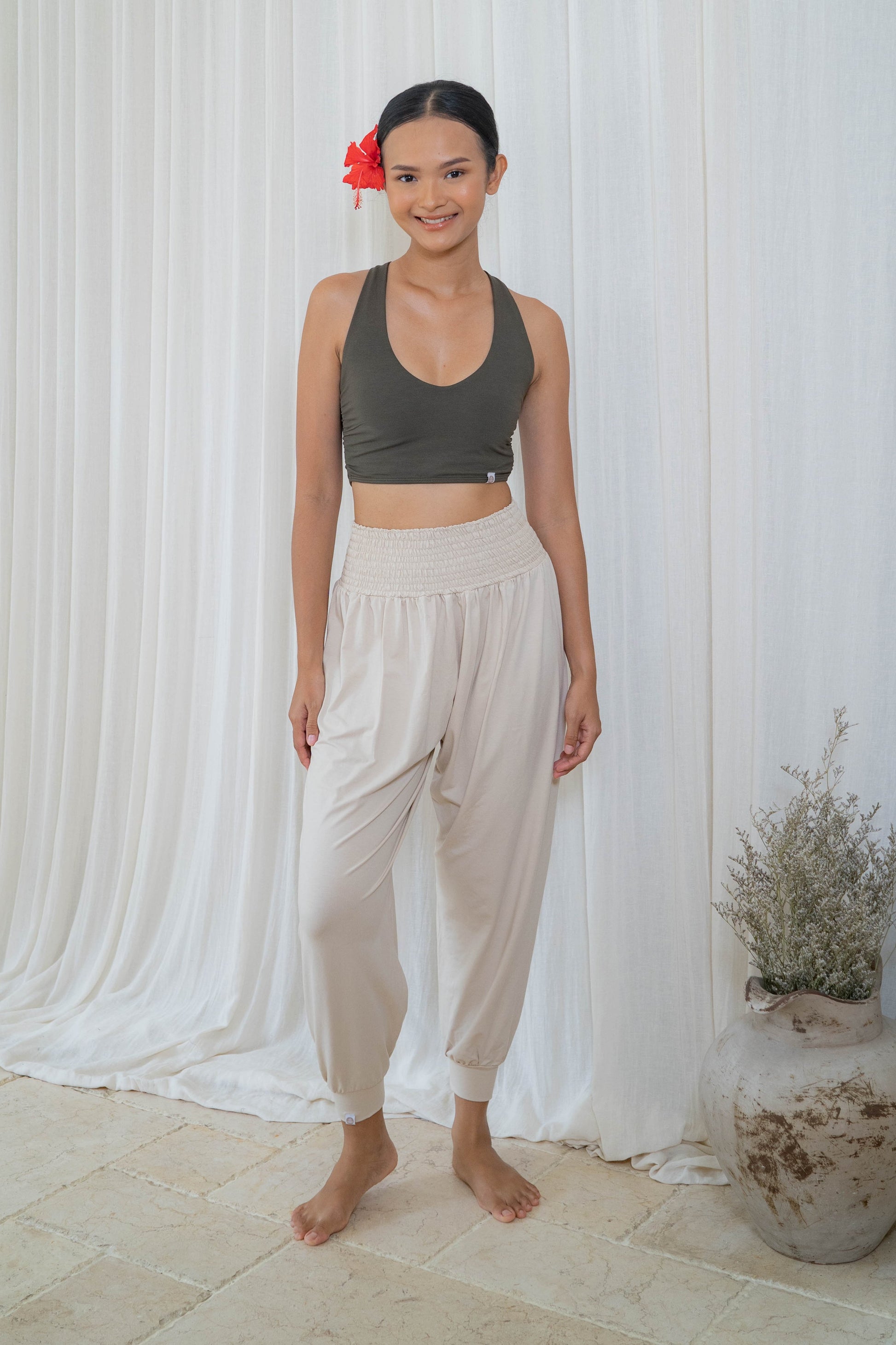 Embrace effortless elegance with the Surya Harem Pants in Seashell. These wide harem pants are designed to offer both comfort and style, making them a perfect addition to your yogawear collection. The relaxed silhouette flows beautifully with each movement, while the ruched waistband, inspired by our popular Yantra Jogger Pants, provides a secure and flattering fit.